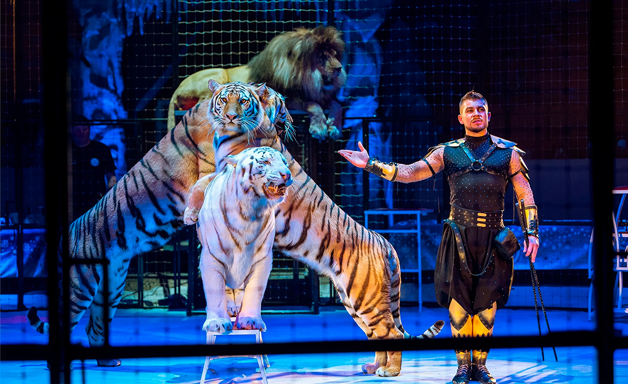 Невероятное цирковое шоу с тиграми, африканским львом и белым филлипинским тигром.